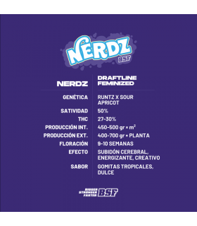 Nerdz Feminized, fruto de la unión de Runtz y Sour Apricot, es un híbrido 50/50 con hasta un 30% de THC. Fácil de cultivar, destaca por su aroma a gomitas tropicales. Especialmente elegida para extracciones, ofrece...