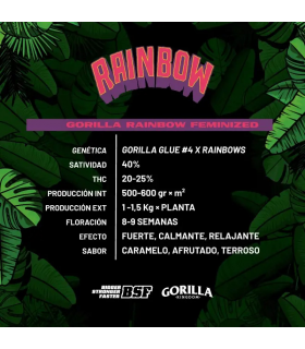 Gorilla Rainbow Feminized., un resultado de la impecable cruza de dos de las variedades más premiadas del banco: “La Bestia de California” Gorilla Glue #4 como madre, y como padre la potente Rainbows, el tesoro al...