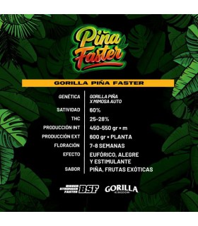 Gorilla Piña Faster es una versión optimizada para acelerar la cosecha, completando su ciclo en solo 7-8 semanas sin perder calidad ni potencia