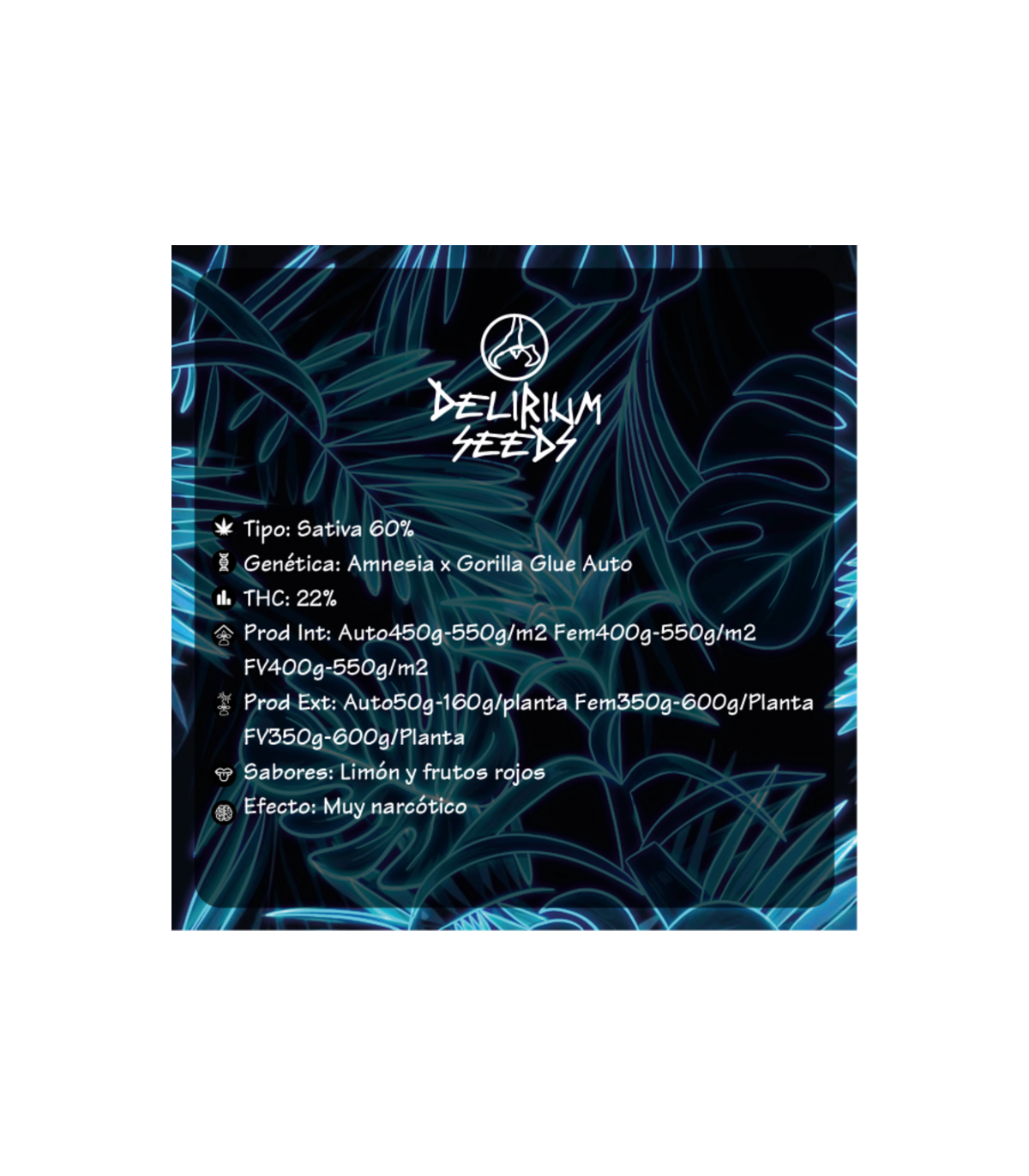 Gorilla Haze es sativa-dominante. Las semillas provienen de una estirpe formidable. Su banco genético destaca por incluir a Gorilla Glue y Amnesia. Alcanza una altura relativamente elevada. Es una variedad resistente a los hongos de forma natural. Es esbelta, con hojas alargadas que a menudo están cubiertas de resina reluciente. Los cogollos alcanzan un tamaño grande, y se cubren de abundante resina. Las plantas producen un aroma fresco a limón. Mientras las plantas maduran, se agregan notas de café y pino, las cuales también se notan en el sabor. Tras el curado, tus dedos quedarán pegajosos. Te estimulará de manera inmediata, aumentará tu sensación de creatividad y sociabilización. Te mantendrás en equilibrio gracias a su porcentaje índico por lo que podrás volar sin perderte.