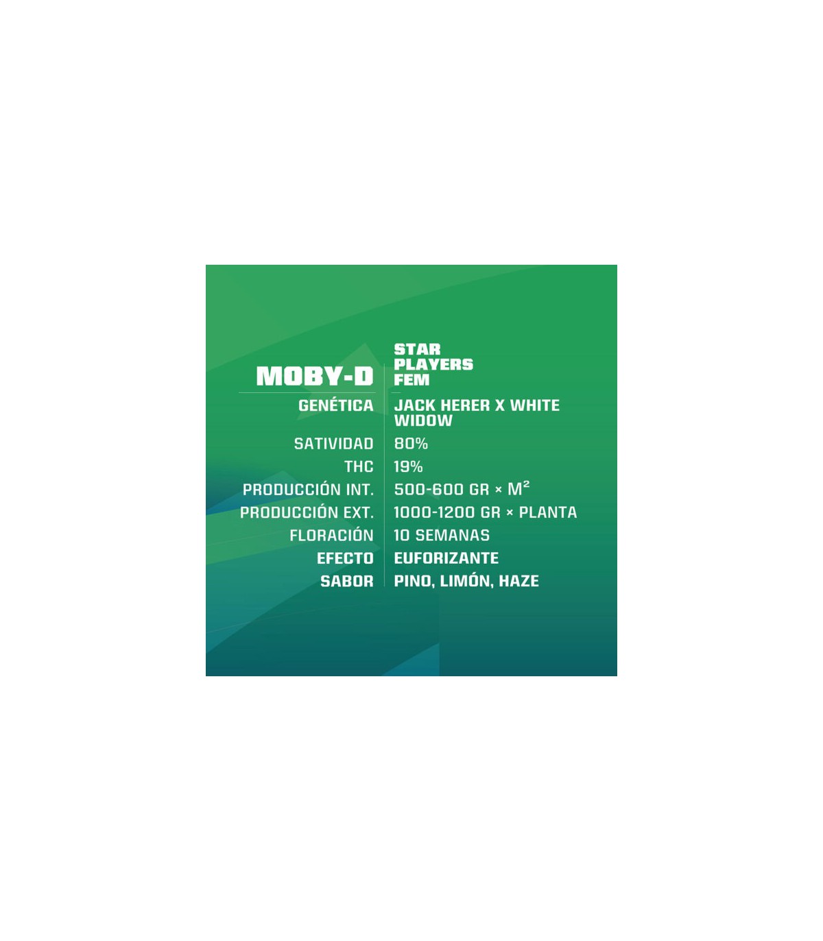 Moby-D Feminized, es resultado del cruce entre el clon elite hembra de Jack Herer que le otorga el sabor y su efecto sativo característico, con un potente macho White Widow de nuestra reserva privada, que le proporciona la rapidez y producción. De esta manera obtuvimos una mezcla perfecta entre resistencia, producción y rapidez, lo que ha posicionado muy rápidamente Moby-D Fem como una variedad connotada, hoy todo un clásico en el mundo del cannabis. Moby-D es una variedad de fácil cultivo y vigor exuberante, por lo que disfruta de altos niveles de fertilización, volviéndola la opción perfecta para cultivadores principiantes y experimentados. Sus aromas florales pasarán de cítricos a pino, madera y haze. Perfecta para desconectarse y navegar en tu mente tan alto como puedas.