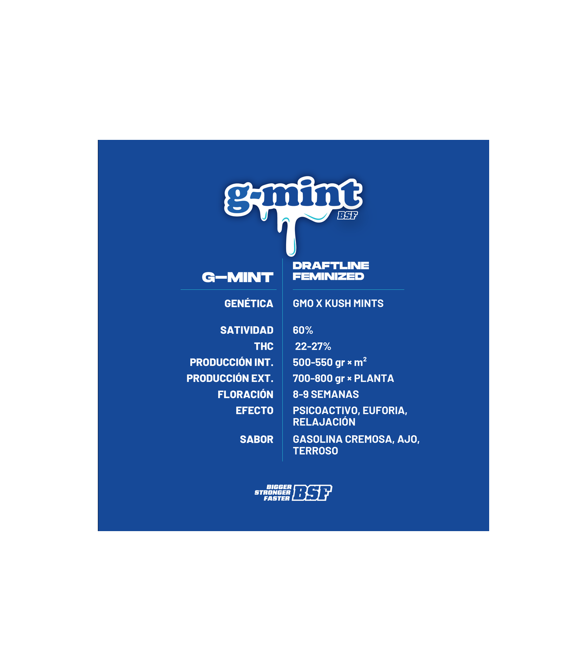 G-Mint Feminized, resultado del cruce entre GMO y Kush Mints, destaca por su rápida floración y una predominancia sativa del 60%. De cultivo medianamente fácil, presenta un THC que oscila entre el 22% y el 27%.