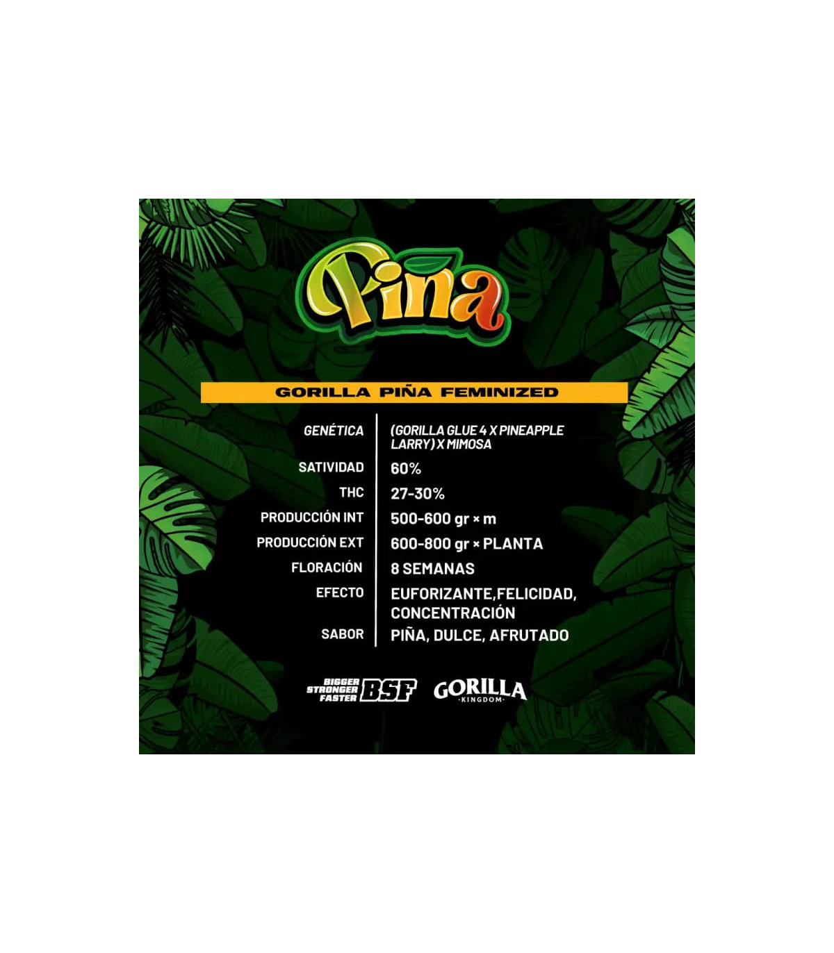 Presentamos Gorilla Piña Feminized, un híbrido con predominancia sativa, con un sabor afrutado marcado por la piña dulce. Es una variedad de fácil cultivo,gran producción y altamente ramificada y perfecta para SCROG. En floración, destaca por su resina, alcanzando niveles de THC entre 27-30%, ideal para extracciones con gran retorno. Produce dos fenotipos: uno claro conun marcado sabor piña y otro oscuro con sabores más afrutados.